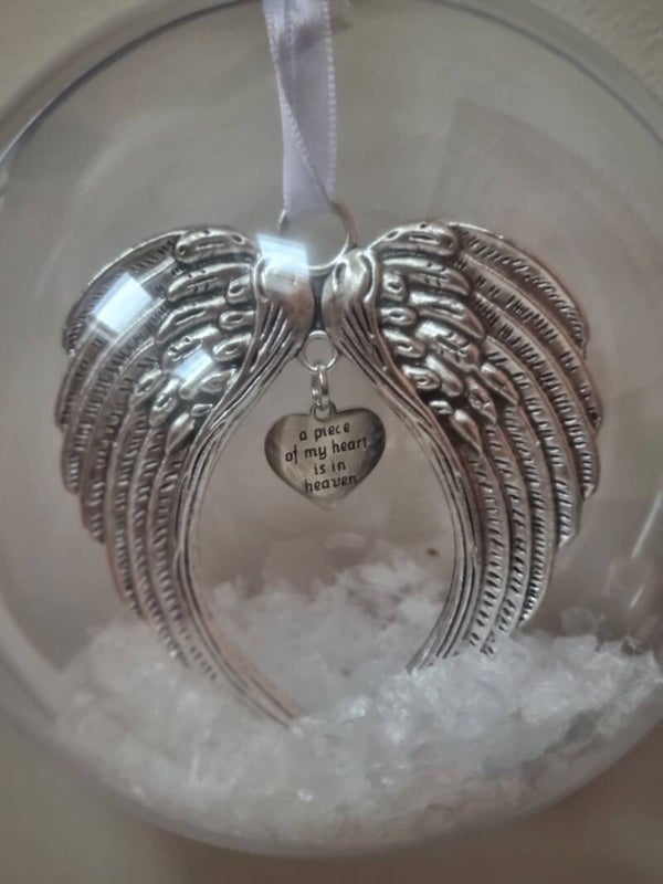 These stunning extra large 10cm personalised angel wing memorial ornaments are a perfect way to remember a lost loved one at christmas or all year round. Whether purchasing a remembrance bauble for yourself, a friend or family member these are a wonderful way to keep loved ones in mind in your home. They can by hung from the ribbon on your Christmas tree, or order the bauble with a stand to display on a mantle or sideboard.
