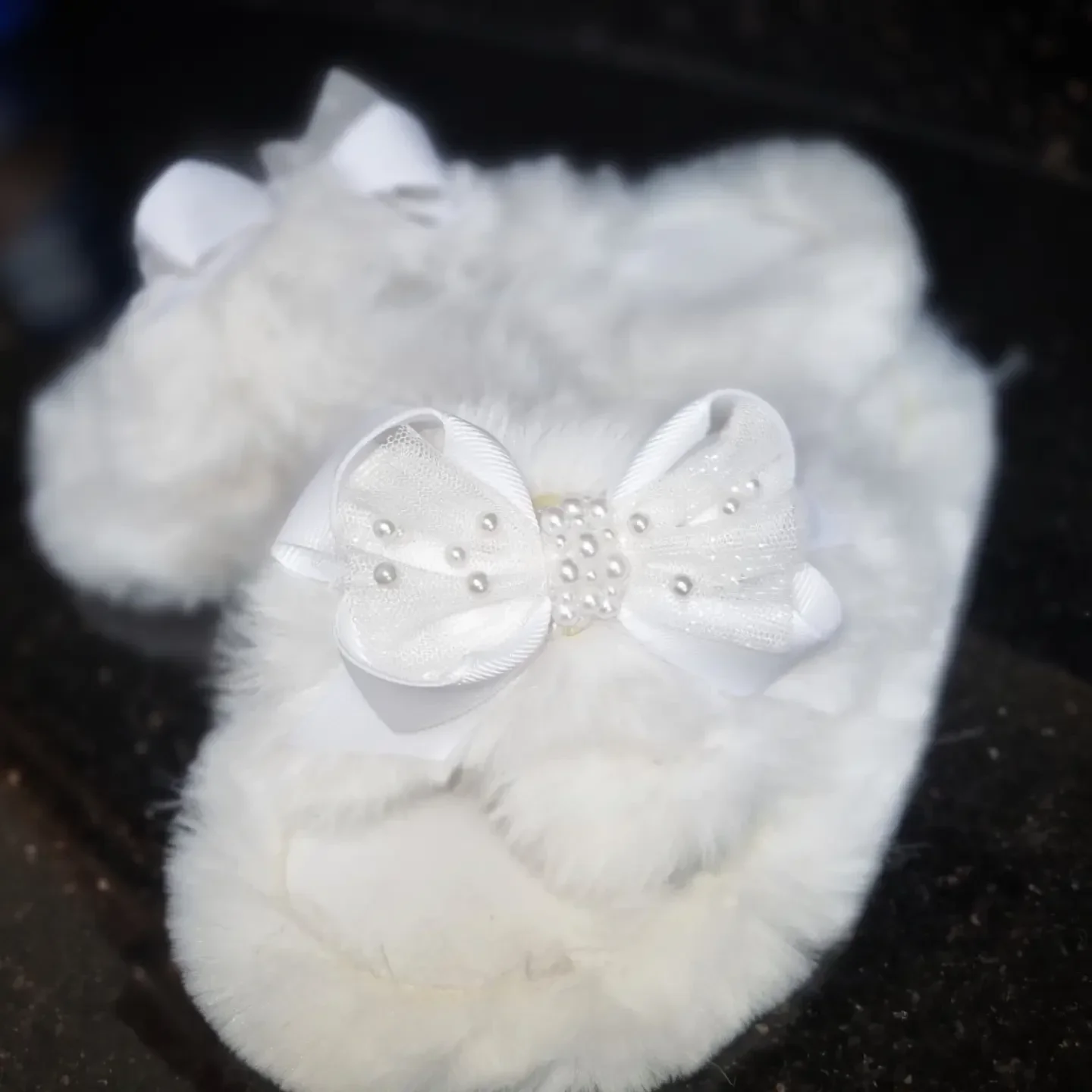 Luxury fluffy slippers with embellished bow. These are sure to put a small on any kids face.